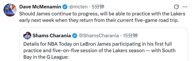 湖人隊記McMenamin轉(zhuǎn)發(fā)了Shams的報道,并表示如果詹姆斯的恢復進程順利,他將能在下周初湖人隊結(jié)束當前五連客之旅后,歸隊參與球隊合練。